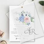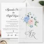 Grafika delikatnego bukietu w kolorystyce różowo błękitnej z dodatkiem eukaliptusów to eleganckie zaproszenia ślubne z motywem kwiatowym. Zaproszenia jak i dodatki utrzymane są w jasnej kolorystyce. Front z kalki sprawia, że są one bardzo delikatne i subtelne.