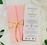 Zaproszenia złote w etui w kolorze jasnego różu, to delikatne połączenie elegancji i subtelności. Zaproszenie utrzymane jest w jasnych kolorach a kolor różowy podkreśla ich wyjątkowość.