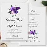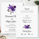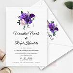 Zaproszenia z motywem kwiatowego bukietu w kolorze fioletu to odważna propozycja dla par chcący się wyróżnić. Dodatkowo delikatne wtrącenia z gałązek eukaliptusa sprawia, że zaproszenia są jednocześnie wyraziste i delikatne. Do wyboru dwa rodzaje papieru: biały gładki lub delikatnie tłoczony, barwiony w masie.