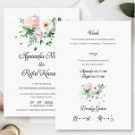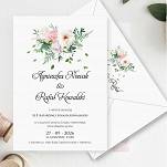 Delikatny bukiet z biało różowymi kwiatami z dodatkiem zieleni z rozsypanymi listami to romantyczna propozycja naszych unikalnych zaproszeń. To propozycja dla par ceniących elegancję i piękno w delikatnym wydaniu.