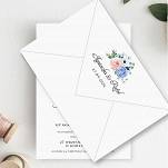 Grafika delikatnego bukietu w kolorystyce różowo błękitnej z dodatkiem eukaliptusów to eleganckie zaproszenia ślubne z motywem kwiatowym. Zaproszenia jak i dodatki utrzymane są w jasnej kolorystyce. Front z kalki sprawia, że są one bardzo delikatne i subtelne.