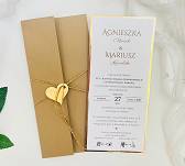 Cena obejmuje zaproszenie (złota ramka) + kopertę BIAŁĄ + etui z papieru barwionego w masie w kolorze ciemnego beżu 250/g + złoty sznureczek + złote lustrzane serduszko.