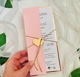 Zaproszenia złote w etui w kolorze jasnego różu, to delikatne połączenie elegancji i subtelności. Zaproszenie utrzymane jest w jasnych kolorach a kolor różowy podkreśla ich wyjątkowość.