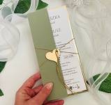 Cena obejmuje zaproszenie (złota ramka) + kopertę BIAŁĄ + etui z papieru w kolorze oliwki 250/g + złoty sznureczek + złote lustrzane serduszko.