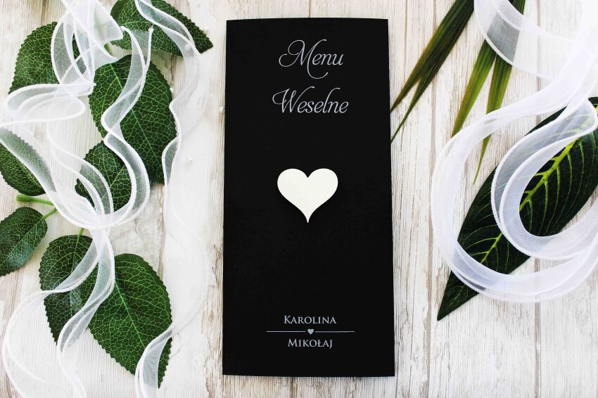 - Gotowe MENU do postawienia na stole składane ze srebrnym serduszkiem 3D